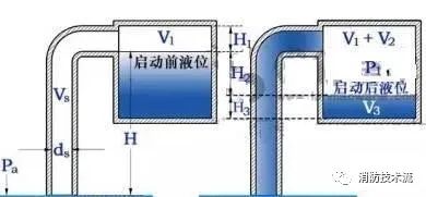 水泵啟動前,真空引水罐內的水應灌至真空引水罐能做到的大存水量,此時罐內部由水+空氣兩部分構成,液面上方的氣體容積為V1。罐內外的壓力與大氣壓力Pa相同。