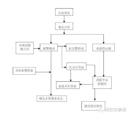 當(dāng)自動噴淋滅火系統(tǒng)的保護區(qū)域內(nèi)發(fā)生火情時,火場環(huán)境溫度升高,閉式噴頭上的玻璃球破裂(或易熔合金熔化),噴頭打開噴水滅火。此時由于濕式報警閥出口側(cè)管網(wǎng)水壓下降,形成壓差,閥瓣組件打開,供水側(cè)水源水不斷補充管網(wǎng)滅火,同時水流也經(jīng)密封環(huán)槽內(nèi)的孔流入延遲器,并迅速充滿,以一定水壓沖擊水力警鈴發(fā)出連續(xù)的報警聲,壓力開關(guān)動作接通電觸點,并將信號反饋至控制中心,以聲、光報警,同時啟動主供水泵進行消防滅火。
