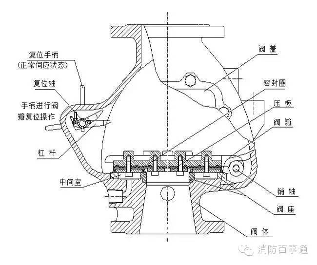 本閥具有防復(fù)位和外部復(fù)位裝置,當(dāng)閥打開以后,杠桿將閥瓣頂住使其不再回到閥座上,需外部逆時針轉(zhuǎn)動復(fù)位手柄復(fù)位(復(fù)位后需將手柄重新回到豎直位置)。