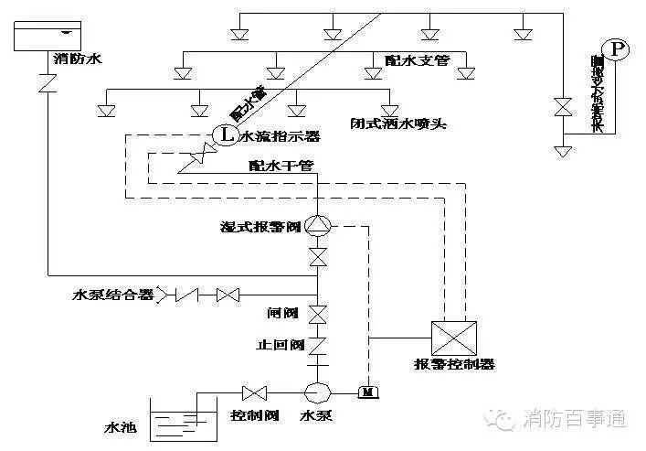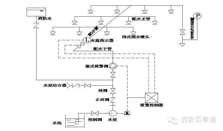 由噴頭、管道系統(tǒng)、濕式報警閥、報警裝置和供水設(shè)施等組成。由于該系統(tǒng)在報警閥的前后管道內(nèi)始終充滿著壓力水,故稱濕式噴水滅火系統(tǒng)或濕管系統(tǒng)。